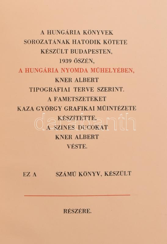 Kolb Jenő: Régi játékkártyák. Magyar és külföldi kártyafestés, XV-XIX.század. Összeáll. és magyarázó szöveggel ellátta - -. 80 színes hasonmással. Hungária Könyvek 6. Bp., 1939, Hungária-ny., 78+6 p. Első kiadás. Lapszámozáson belül egészoldalas és szövegközti képekkel gazdagon illusztrált. Kiadói illusztrált félvászon-kötés, kiadói papír védőborítóban, felül festett lapélekkel, szép állapotban. "A Hungária könyvek sorozatának hatodik kötete. Készült Budapesten, 1939 őszén, a Hungária Nyomda műhelyében, Kner Albert tipográfiai tervei szerint. A fametszeteket Kaza György Grafikai Műintézete készítette, a színes dúcokat Kner Albert véste." Számozatlan példány.