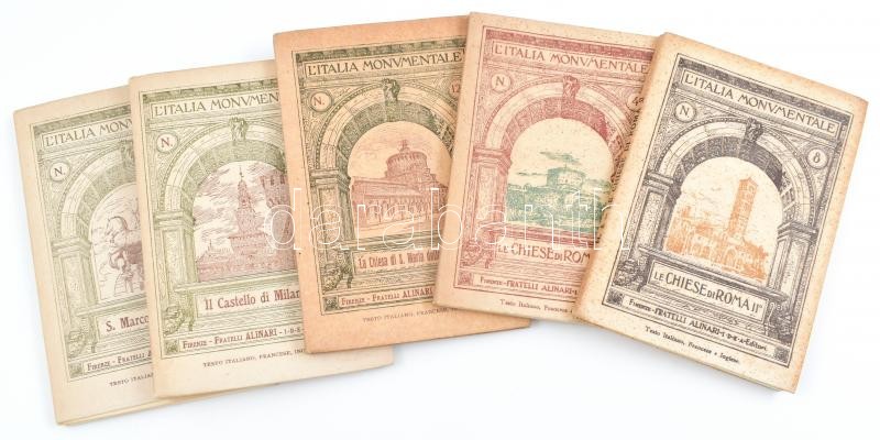 L'Italia Monumentale sorozat 5 kötete: Le Chiese di Roma I-II.; S. Marco di Venezia; La Chiesa di S. Maria delle Grazie; Il Castello di Milano. (No. 4., 7., 8., 12., 23.) Firenze, 1916-1925, Fratelli Alinari. Fekete-fehér képekkel illusztrálva. Olasz nyelven. Kiadói papírkötés, néhány kötet kissé foltos borítóval.