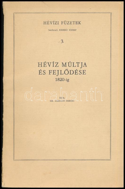 Zákonyi Ferenc: Hévíz múltja és fejlődése 1820-ig. A szerző által DEDIKÁLT példány. Hévízi Füzetek. 3. Hévíz, 1974.,(Kecskemét, Petőfi-ny.) 79+2 p.+III-XXVIII t. Kiadói papírkötés, javított gerinccel. + Hévíz leporelló, fekete-fehér fotókkal.