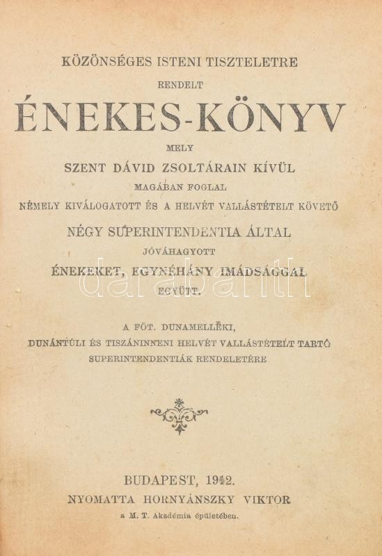 Közönséges isteni tiszteletre rendelt énekes könyv, mely Szent Dávid zsoltárain kívül magában foglal némely kiválogatott és a helvét vallástételt követő négy superintendentia által jóváhagyott énekeket, egynehány imádsággal együtt. Bp., 1912., Hornyánszky Viktor, 404 p. Korabeli bársony-kötés, bakelit kötéstáblákkal, aranyozott lapélekkel, az elülső kötéstáblán csont díszítéssel, kissé kopott borítóval, az elülső táblán kis sérüléssel, bejegyzésekkel.