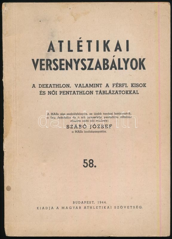 Atlétikai versenyszabályok. A dekathlon, valamit a férfi, kisok és nÅ‘i pentathlon táblázatokkal. Szerk.: Szabó József. Bp., 1944, Magyar Athletikai Szövetség, 103+(1) p. Kiadói papÃrkötés, foltos borÃtóval, sérült, hiányos gerinccel.