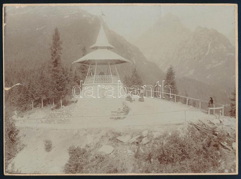 Beschreibung: cca 1900 Tátra, Tarpatak-völgy, Szilágyi Dezső emléktorony, kilátó, fotó, kartonra kasírozva, szélén kis szakadás, 12x17 cm
