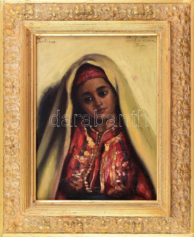 Beschreibung: Paczka Ferenc (1856-1925): Fatima. Olaj, karton. Jelzett. Dekroatív fakeretben. 23x17,5 cm.