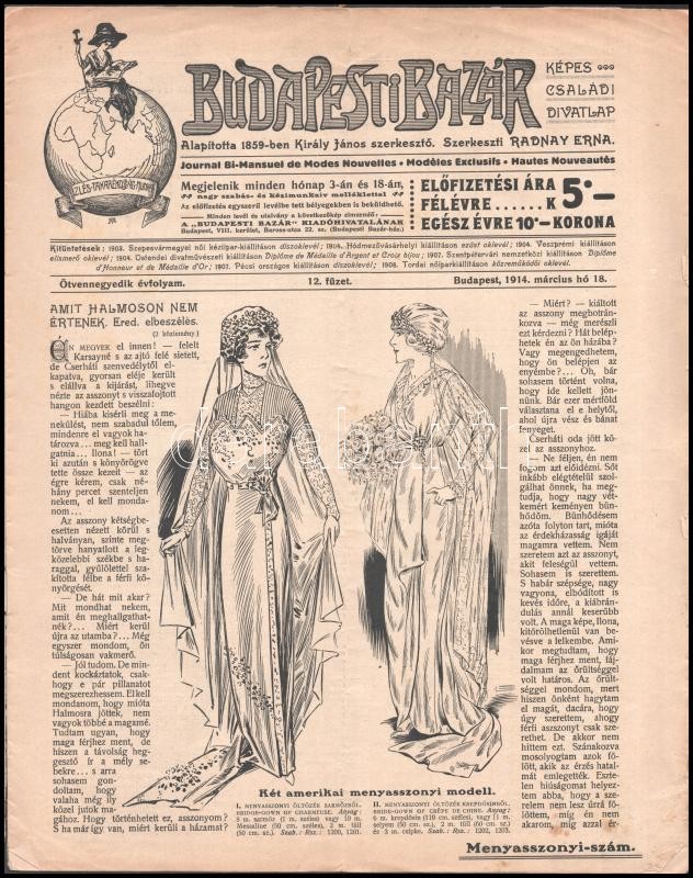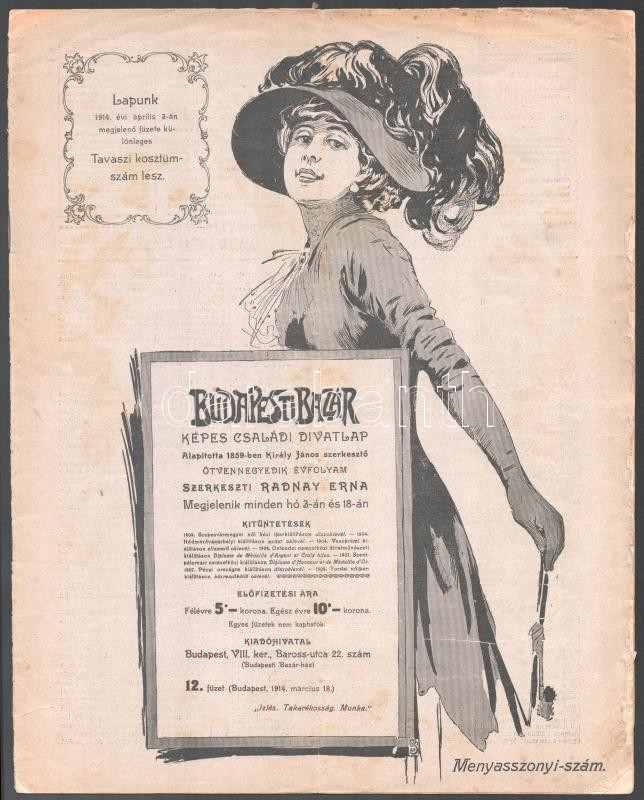1914 Budapesti Bazár, 12. füzet, Menyasszonyi szám, sok hirdetéssel és... https://www.darabanth.com/de/419-Fernauktion/419.0/Kunst-Dokumente-andere-Sammelgebiete/Drucksachen~1000002/1914-Budapesti-Bazar-12-fuzet-Menyasszonyi-szam-sok-hirdetessel-es-illusztracioval-a-lap~II2646223