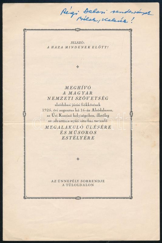 1925 Meghívó a Magyar Nemzeti Szövetség alsódabasi járási fiókkörének 1925. évi auguszus hó 16-ánb Alsódabason, az Úri Kaszinó helyiségeiben, illeltőleg az udvartéren nyári sátorban tartandó magalakuló ülésére és műsoros estélyére. A védnökök között id. Dinnyés Lajos (1855-1930), a szervezők között: ifj. Dinnyés Lajos (1901-1961) későbbi kisgazda politikus, országgyűlési képviselő, majd miniszterelnök. Gyoma, Kner Nyomda, bejegyzésekkel, aláhúzásokkal, hajtott.