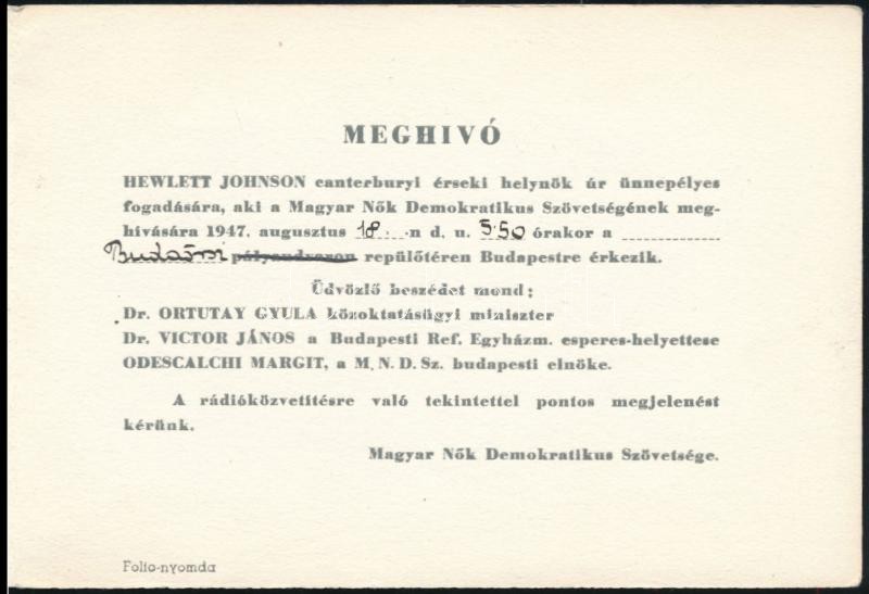 Beschreibung: 1947 Magyar Nők Demokratikus Szövetsége meghívója Péchy Blanka színésznő részére, Hewlett Johnson canterbury érsek fogadására a budaörsi repülőtéren
