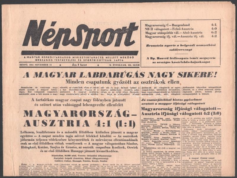 Beschreibung: 1954 Népsport november 15-i száma, benne tudósítás a Magyarország-Ausztria labdarúgó mérkőzésről, az Aranycsapat tagjaival