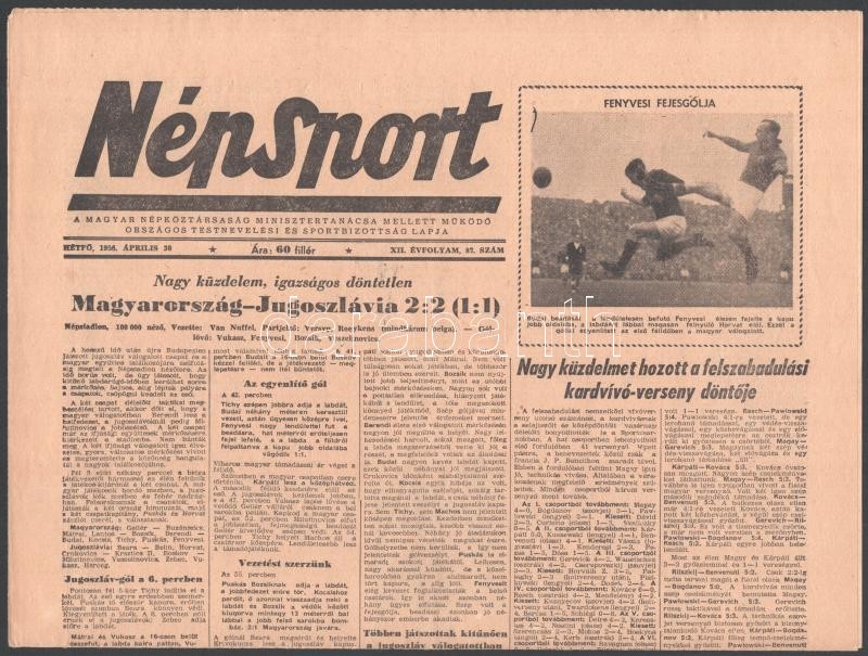 Beschreibung: 1956 Népsport április 30-i száma, benne tudósítás a Magyarország-Jugoszlávia labdarúgó mérkőzésről, az Aranycsapat tagjaival