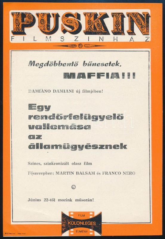 1972 Egy rendőrfelügyelő vallomása az államügyésznek, Puskin Filmszính... https://www.darabanth.com/de/419-Fernauktion/419.0/Kunst-Dokumente-andere-Sammelgebiete/Drucksachen~1000002/1972-Egy-rendorfelugyelo-vallomasa-az-allamugyesznek-Puskin-Filmszinhaz-kisplakat-keto~II2652116
