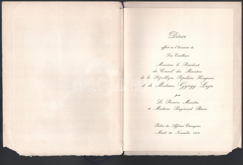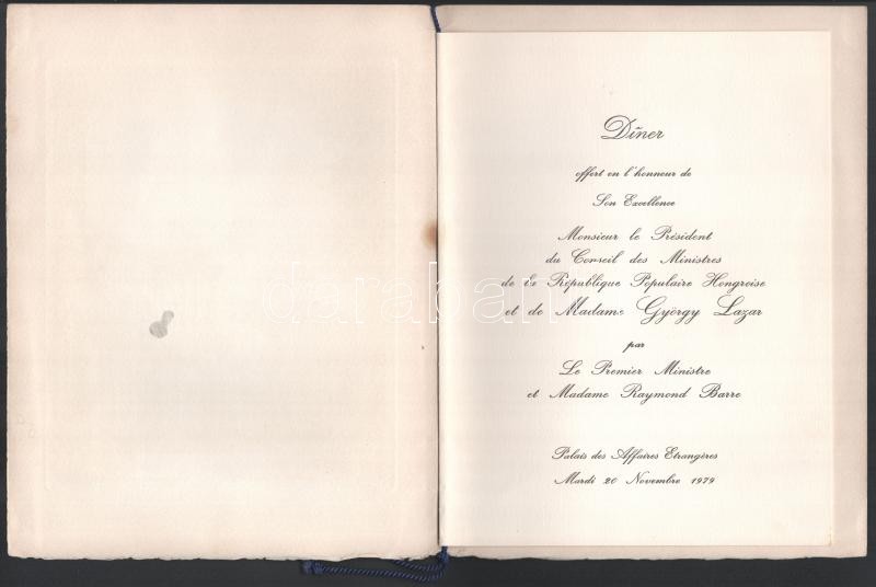 1979 Lázár György (1924-2014) és felesége részére vacsorára meghívó Ra... https://www.darabanth.com/de/419-Fernauktion/419.0/Kunst-Dokumente-andere-Sammelgebiete/Drucksachen~1000002/1979-Lazar-Gyorgy-1924-2014-es-felesege-reszere-vacsorara-meghivo-Raymond-Barre-francia-~II2646788