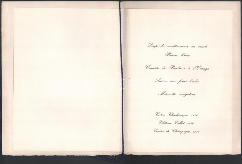 Beschreibung: 1979 Lázár György (1924-2014) és felesége részére vacsorára meghívó Raymond Barre francia miniszterelnöktől + menü, 2 db
