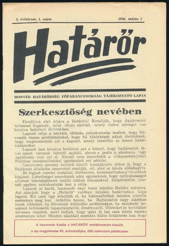 1986 Határőr folyóirat I. évfolyam 1. számának 500 példányban megjelen... https://www.darabanth.com/de/419-Fernauktion/419.0/Kunst-Dokumente-andere-Sammelgebiete/Drucksachen~1000002/1986-Hataror-folyoirat-I-evfolyam-1-szamanak-500-peldanyban-megjelent-unnepi-hasonmas-ki~II2646917