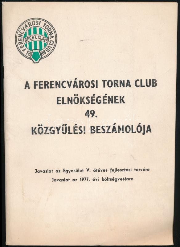 A Ferencvárosi Torna Club elnökségének 49. közgyűlési beszámolója. Javaslat az Egyesület V. ötéves fejlesztési tervére. Javaslat az 1977. évi költségvetésre. 82 p. Tűzött papírkötés. + Kiegészítés, hibajegyzék és kísérőfüzet.