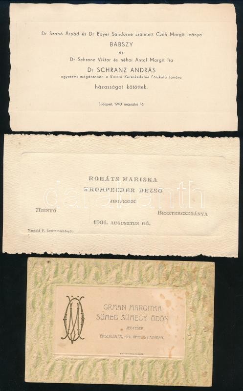 Beschreibung: cca 1900-1940 3db felvidéki esküvői meghívó: Érsekújvár, Besztercebánya, Kassai Kereskedelmi Főiskola tanára