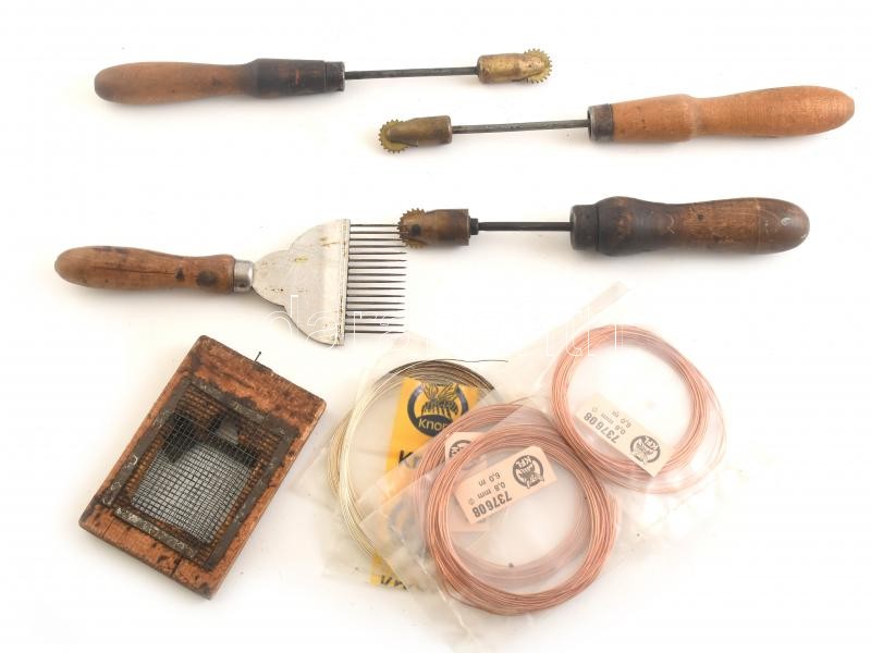 Beschreibung: Méhészeti kellékek: fedelező villa, 3 db lép benyomó, régi méhkirálynő jelölő ketrec, 5 csomag drót