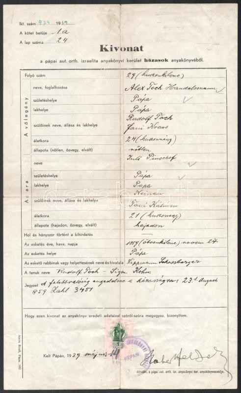 1939 Kivonat a pápai aut. orth. izraelita kerület házassági anyakönyvé... https://www.darabanth.com/de/419-Fernauktion/419.0/Kunst-Dokumente-andere-Sammelgebiete/Judaica~500027/1939-Kivonat-a-papai-aut-orth-izraelita-kerulet-hazassagi-anyakonyvebol~II2645248