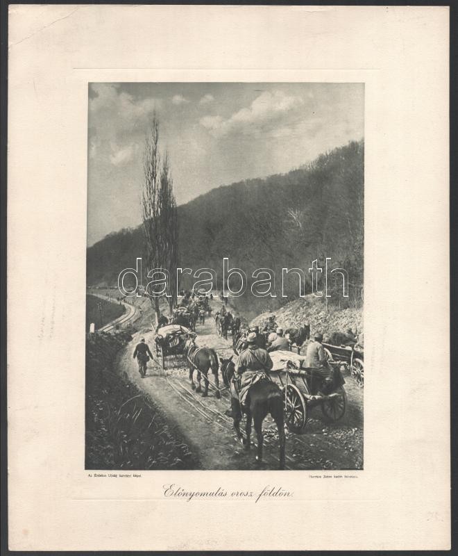 cca 1914-1918 3 db I. világháborús nyomat: Előnyomulás orosz földön. Az Érdekes Újság harctéri képeiből. (Az Országos Magyar Hadimúzeum Egyesület kizárólagos terjesztése). Bp., Légrády Testvérek kiadása. Minimális foltokkal. Sérülésekkel. 25x17 cm