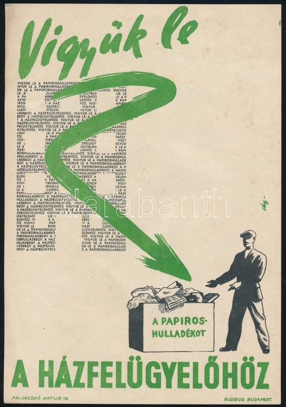 cca 1950 "Vigyük le a papiroshulladékot a házfelügyelőhöz", ... https://www.darabanth.com/de/419-Fernauktion/419.0/Kunst-Dokumente-andere-Sammelgebiete/Plakat~1000003/cca-1950-Vigyuk-le-a-papiroshulladekot-a-hazfelugyelohoz-kisplakat-Bp-Globus-ny-21x14~II2649805