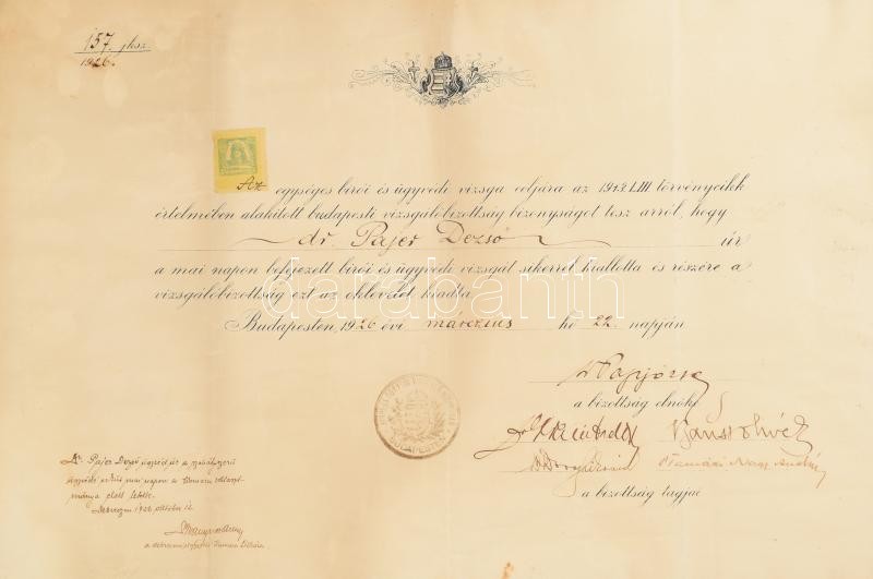 1926 Tasnádi Nagy András (1882-1956) magyar politikus, igazságügyi miniszter az Imrédy- és a második Teleki-kormányban, az 1945 előtti képviselőház utolsó elnökének, Bauss Olivér dr. curiai elnöki tanácsos és Dorogi Ervin, a Magyar Golf Club alelnöke és két másik személy beazonosítandó autográf aláírásai, ügyvédi vizsga oklevélen, mint a vizsgáló bizottság tagjai, 10000 korona okmánybélyeggel, hajtásnyomokkal. 35x49,5 cm