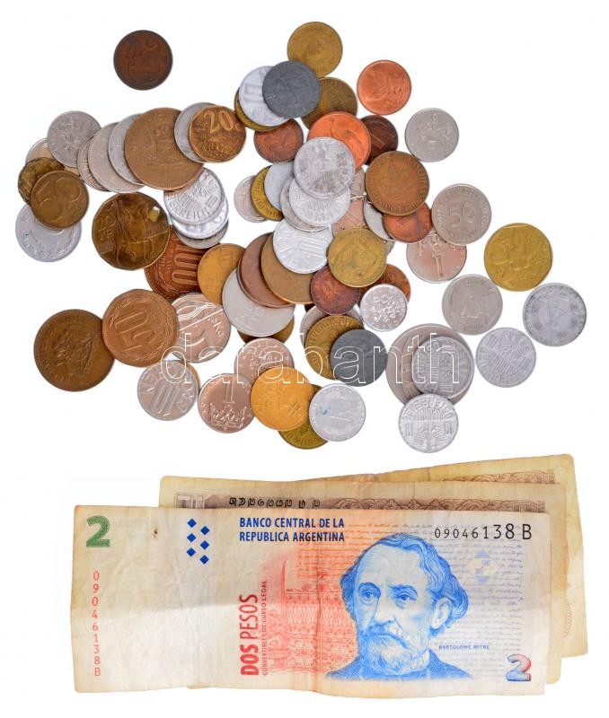 74db-os vegyes külföldi fémpénz + 3db bankjegy tétel klf országokból, közte német, thaiföldi, argentin pénzek T:vegyes