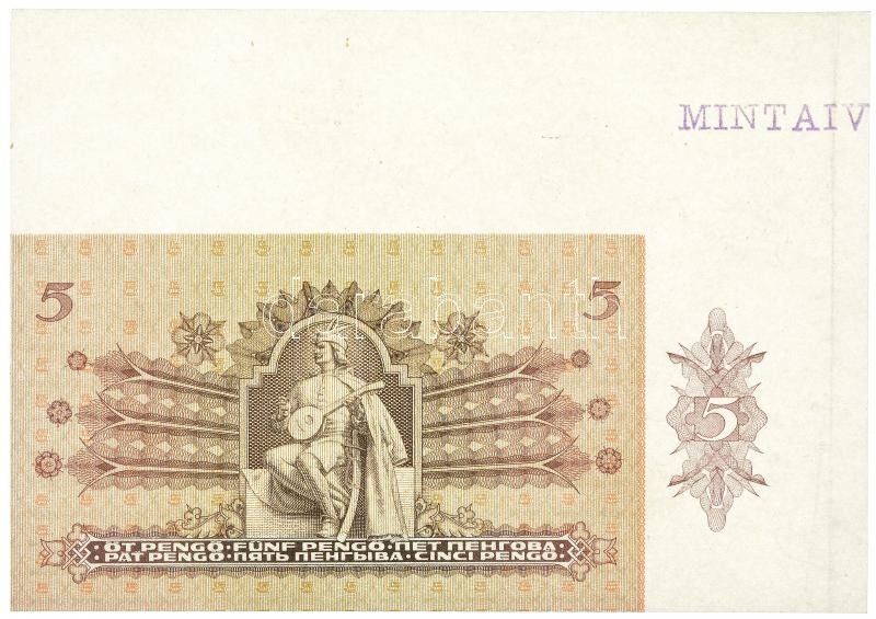 Beschreibung: 1939. 5P csak hátlapi nyomat, ívből kivágva, ívszéllel, "MINTAÍV" bélyegzőrészlettel T:I,II hajtás az ívszélen