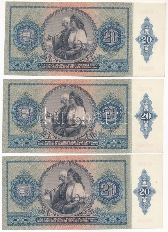 1941. 20P (3x) sorszámkövető pár "C 043 004981 - C 043 004982&quo... https://www.darabanth.com/de/419-Fernauktion/419.0/Numismatik/Ungarische-Banknoten~2000008/1941-20P-3x-sorszamkoveto-par-C-043-004981-C-043-004982-es-egyugrasos-sorszamkoveto-~II2650622