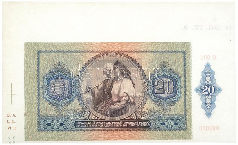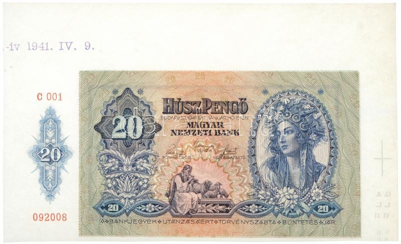 1941. 20P "C 001 092008" ívből kivágva, ívszéllel, "(..... https://www.darabanth.com/de/419-Fernauktion/419.0/Numismatik/Ungarische-Banknoten~2000008/1941-20P-C-001-092008-ivbol-kivagva-ivszellel-iv-1941-IV-9-belyegzoreszlett~II2649247