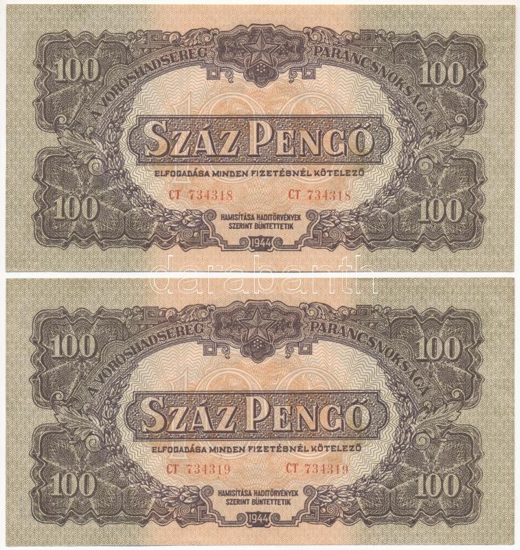 1944. 100P (2x) "A Vöröshadsereg Parancsnoksága", "CT 7... https://www.darabanth.com/de/419-Fernauktion/419.0/Numismatik/Ungarische-Banknoten~2000008/1944-100P-2x-A-Voroshadsereg-Parancsnoksaga-CT-734318-734319-sorszamkovetok-TII--Ada~II2650284