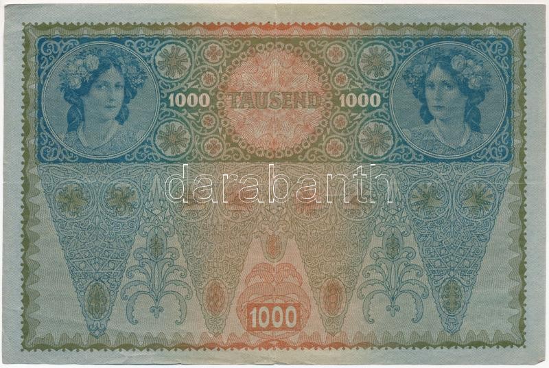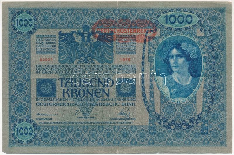 Ausztria 1919. (1902) 1000K, 2. kiadás, vízszintes "DEUTSCHÖSTERREICH" felülbélyegzéssel, mindkét oldal német, eltérő hátlappal T:III hajtások mentén szakadások, de ettől eltekintve szép papír Austria 1919. (1902) 1000 Kronen, 2nd issue, with horizontal "DEUTSCHÖSTERREICH" overprint, both sides in german, and the reverse side is different from the obverse C:F tears along fold lines, but nice paper Krause P#61