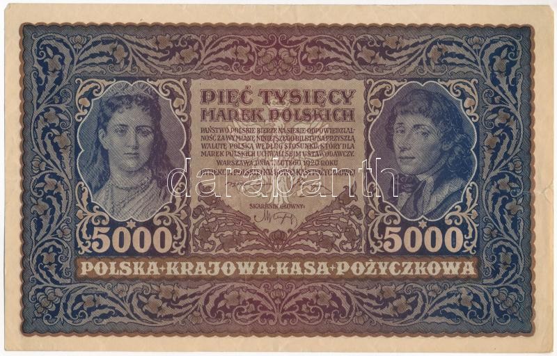 Polan... https://www.darabanth.com/de/419-Fernauktion/419.0/Numismatik/Weltweit-Banknoten~2000014/Lengyelorszag-1920-5000M-131676-TIII-kis-szakadas-Poland-1920-5000-Marek-131676-CF-small-~II2650941