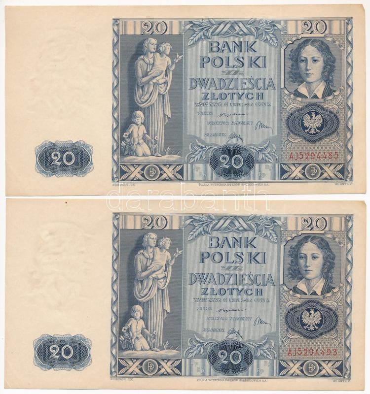 Beschreibung: Lengyelország 1936. 20Zl (2x) közeli sorszámúak T:III