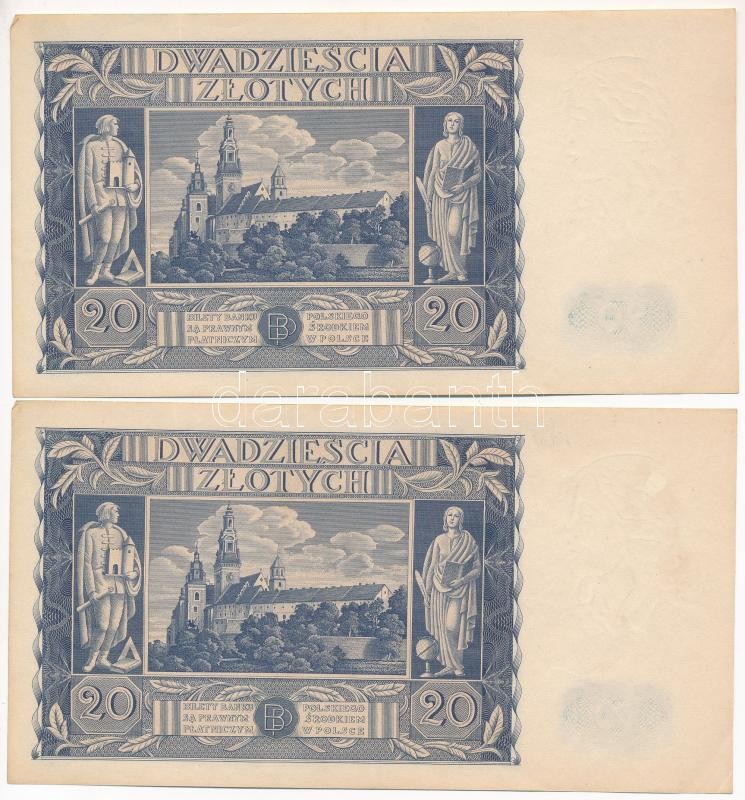 Poland 1936. 20... https://www.darabanth.com/de/419-Fernauktion/419.0/Numismatik/Weltweit-Banknoten~2000014/Lengyelorszag-1936-20Zl-2x-kozeli-sorszamuak-TIII-Poland-1936-20-Zlotych-2x-close-serial~II2650704