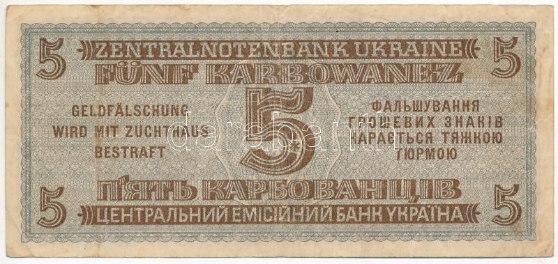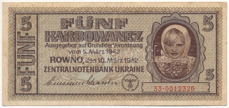 Ukrajna / Német megszállás 1942. 5K T:III Ukraine / German occupation ... https://www.darabanth.com/de/419-Fernauktion/419.0/Numismatik/Weltweit-Banknoten~2000014/Ukrajna-Nemet-megszallas-1942-5K-TIII-Ukraine-German-occupation-1942-5-Karbowanez-CF-Krau~II2647424