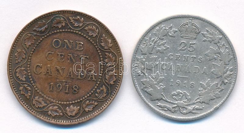 Kanada 1918. 1c Br + 25c Ag T:2- patina, kis ph Canada 1918. 1 Cent Br + 25 Cents Ag C:VF patina, small edge error Krause KM#21,24