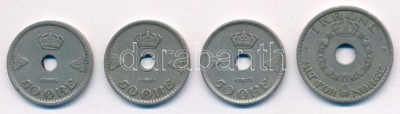 Norway 1925. 1 Krone Cu-Ni + 1926. 50 Öre Cu-Ni + 1927. 50 Öre Cu-Ni + 1929. 50 Öre Cu-Ni (rarer year) C:VF,F