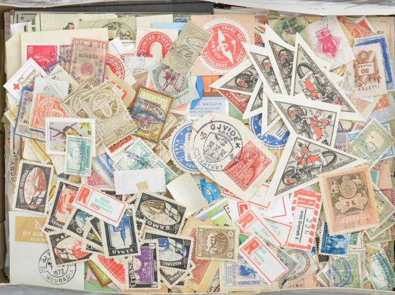 Beschreibung: 2 kg vegyes parafilatélia tétel, benne díjjegyes kivágások, ragjegyek, illetékbélyegek, levélzárók, bélyegzések, néhány irat és nyomtatványok