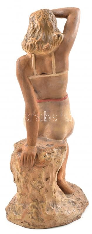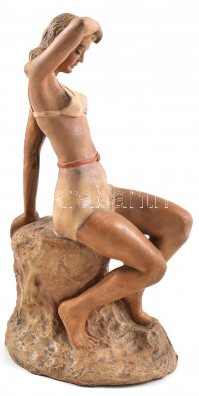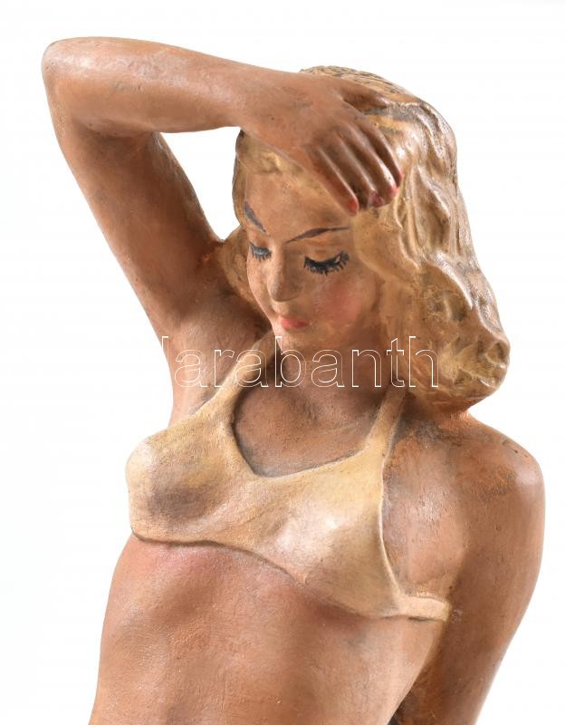 Beschreibung: Bokor István 1942 jelzéssel: Art deco napozó nő. Színes mázas kerámia, jelzett, kopásnyomokkal, , m: 27 cm