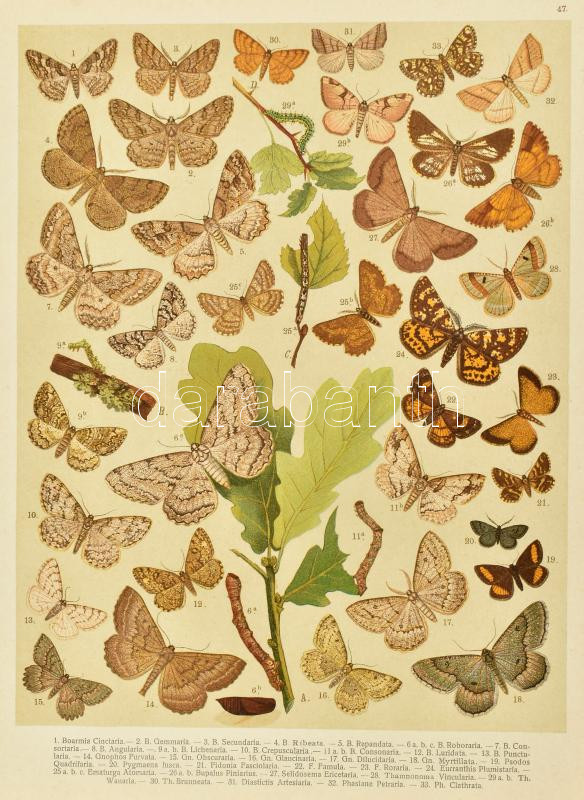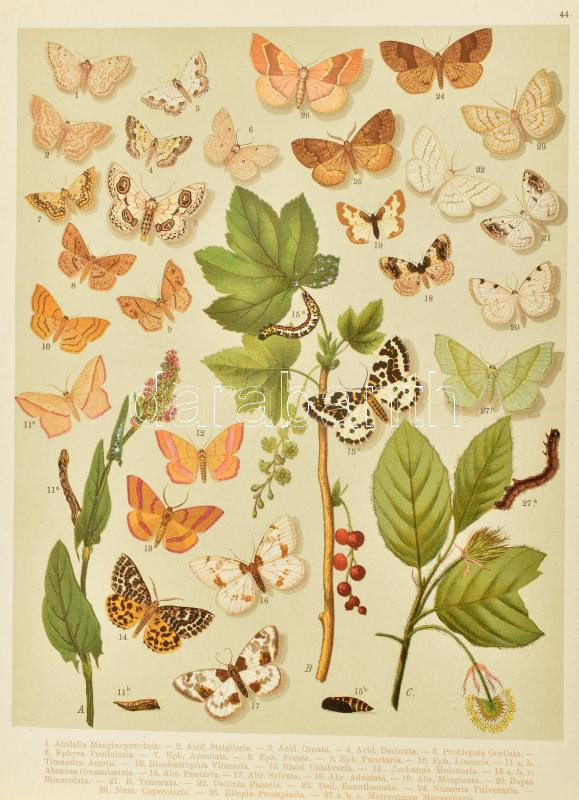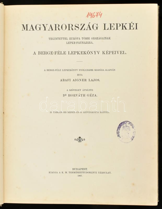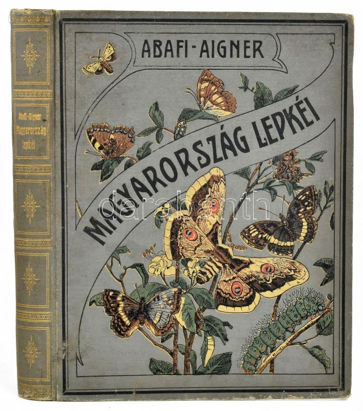 Abafi Aigner Lajos Magyarország lepkéi Tekintettel Európa többi országainak lepke-faunájára Bp. 1907. Athenaeum. VI, XXXII, 137 l. 51 t. (ebből 50 színes kromolitográfia) (Természettudományi könyvkiadó vállalat LXXVII köt.) Kiadói, festett, illusztrált egészvászon kötésben. Gerincen kis kopással, intézményi bélyegzőkkel. Jó példány