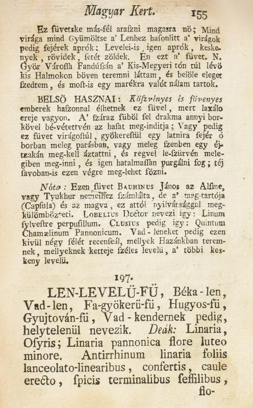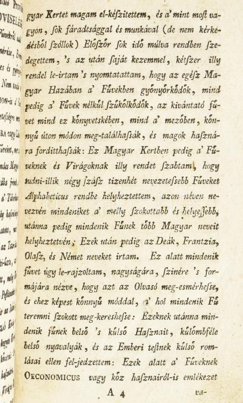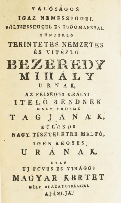 CSAPÓ, JÓZSEF Uj füves és virágos magyar kert, mellyben mindenik fűnek és virágnak neve, neme, ábrázatja, természete és ezekhez képest külömbféle hasznai, értelmesen megjegyeztettek -- által. Pozsony, 1775. Landerer Mihály. 1 rézm. címkép (szerző arcképe), 6 sztl. lev., 9-305 p., 12 sztl. lev. Első kiadás. A címképmetszet hiányzik. Az ajánlás négy levele másolatban pótolt. A szerző, Csapó József (1734-1799) Debrecen város főorvosa volt, ezen művének fő célja az orvosilag használható növények, gyógynövények bemutatása volt, a leírt több száz növényfaj neveit öt nyelven is közli, de munkája inkább orvosi, mint botanikai jellegű.. Későbbi félbőr-kötésben, restaurált lapokkal.