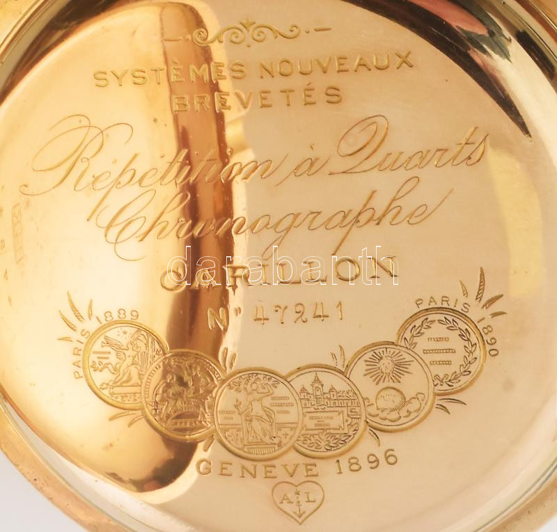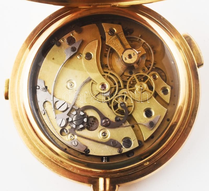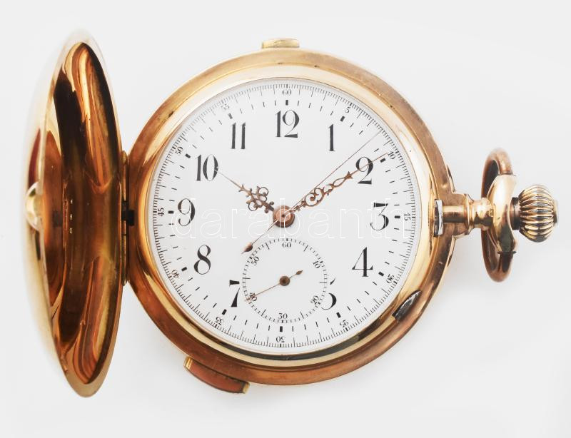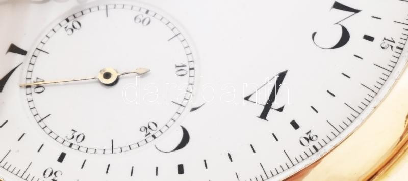 Carillon negyedütős, kronográfos zsebóra 14K arany (Au) fedeles zsebóra, jelzett arany porvédő, működő, gyönyörű állapotban. d: 55 mm br 121 g. / Carillon quarter repeater chronograph pocket watch 14K gold (Au) cover pocket watch, marked gold dust cover, working, beautiful condition. d: 55 mm br 121 g