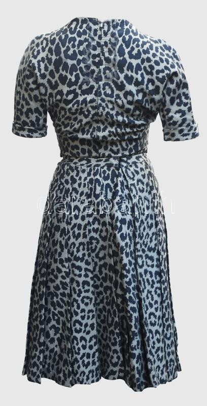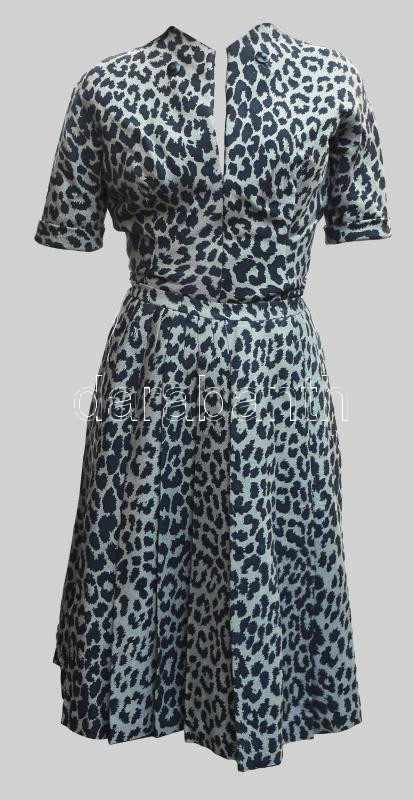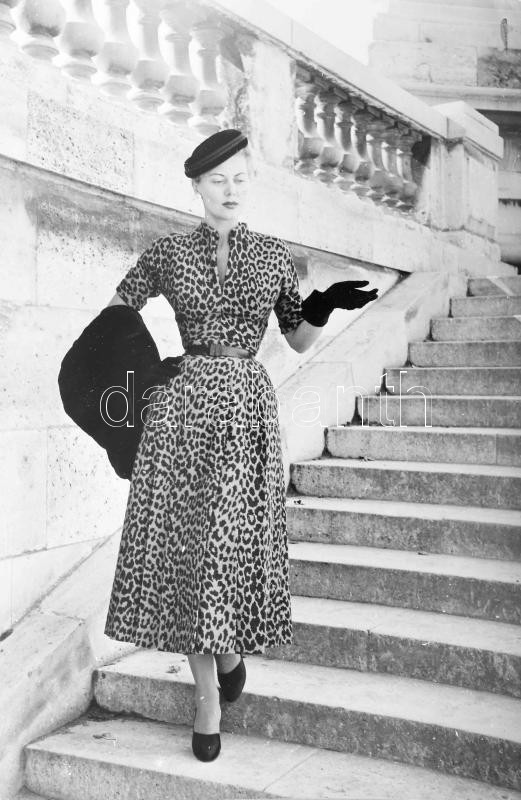 Christian Dior Haute Couture "Jungle" kétrészes day dress. A ruhát viselő Lénárt Angéla (1921-2004) modell eredeti divatfotójával. Terv: Christian Dior. 1952 őszi kollekció, Párizs. Leopárdmintával printelt, kézzel varrott selyem. Alapanyag: Bianchini-Férier. Jó állapotban. /// Christian Dior 1947-ben tervezte meg az első leopárdmintával printelt kollekcióját, melyet a "Jungle" sorozat részeként számtalan további variáció követett. A minta múzsájának Mizza Bricard modellt tartják, akinek femme fatale stílusa ihlette a ruhakollekciót. A jelen aukción szereplő darab 1952-ben készült - érdekesség, hogy annak a Lénárt Angélának a tulajdonát képezte, aki Christian Dior első magyar manökene volt: 1947-től dolgozott a mára ikonná vált francia divattervezővel. Christian Dior Haute Couture "Jungle" two-piece day dress. With the original fashion photo of the model Angéla Lénárt (1921-2004) wearing the dress. Design: Christian Dior. Fall 1952 collection, Paris. Hand-stitched silk printed with a leopard print. Base material: Bianchini-Férier. In good condition. /// Christian Dior designed his first leopard print collection in 1947, which was followed by countless other variations as part of the "Jungle" series. Model Mizza Bricard is considered to be the muse of the pattern, whose femme fatale style inspired the clothing collection. The piece included in this auction was made in 1952 - it is interesting that it was owned by Angéla Lénárt, who was Christian Dior's first Hungarian mannequin: from 1947 she worked with the now iconic French fashion designer.
