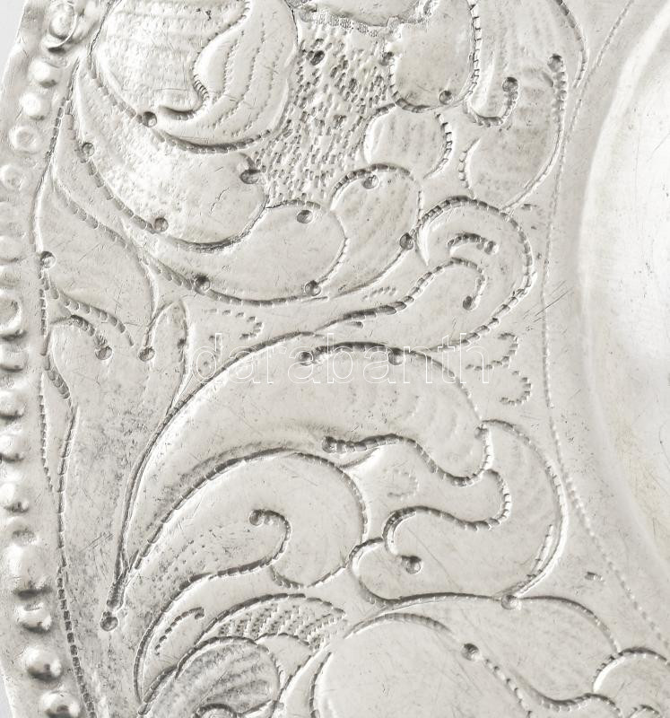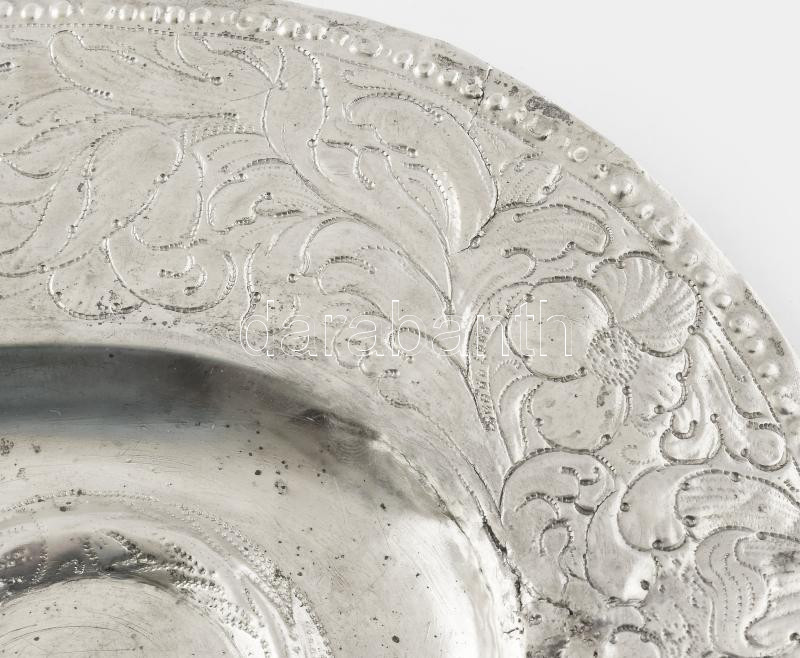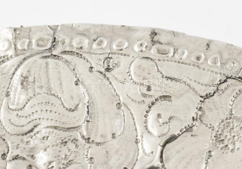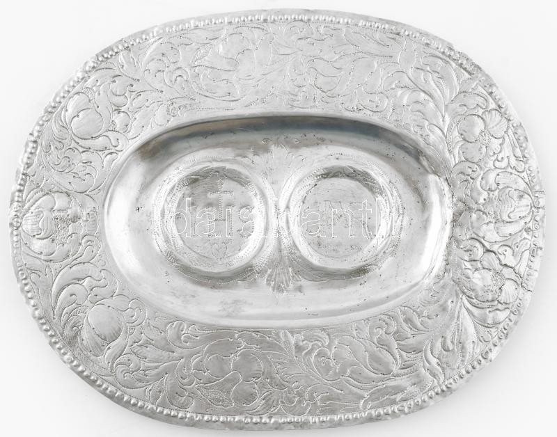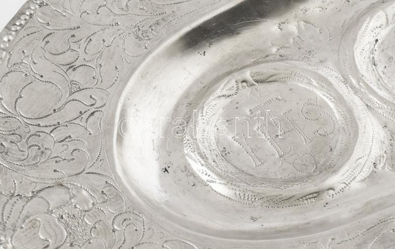 Ezüst (Ag) Ampolna-tartó tál. Nagyszeben, 17. sz. Pontsoros dÃszÃtéssel lezárt vastag virágdÃszes perem, öblében ampolnatartó támaszték, ezekben Krisztus és Mária monogramokkal. TisztÃtott, sérült, régi javÃtásokkal, 21,5x27,5 cm