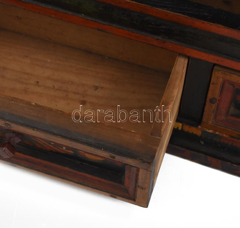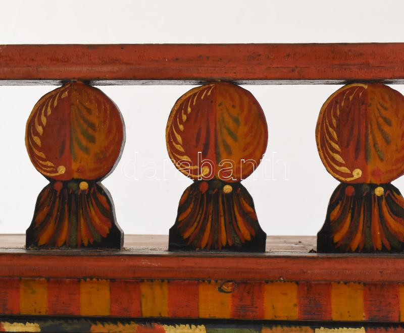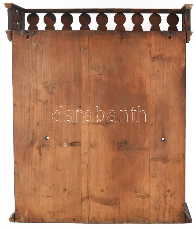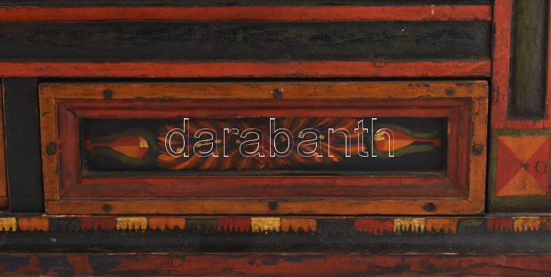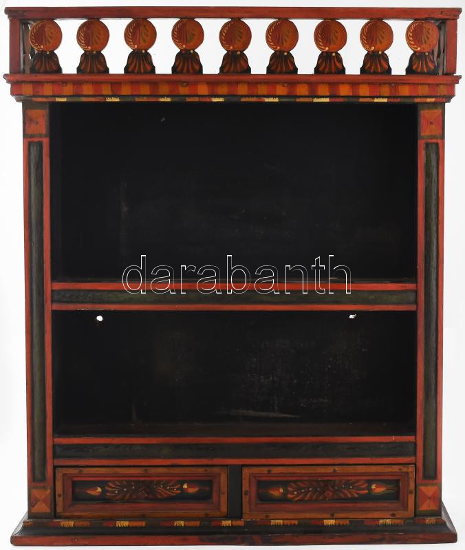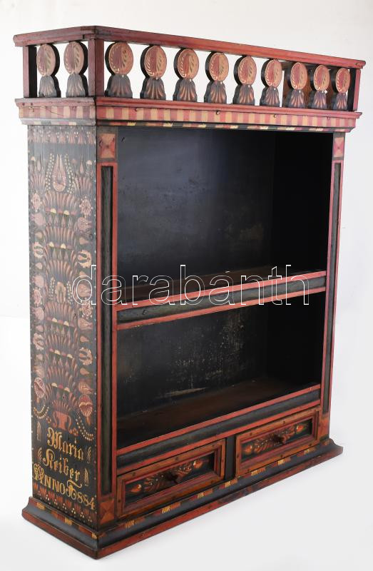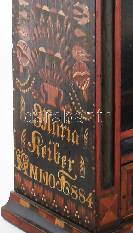 Fali téka. Harta, 1884. Festett, faragott fenyőfa két fiókkal, tulajdonosi felirattal: "Konrad Leitert / Maria Reiber". Oldalán és elszórtan festett olasz korsó és belőle kinövő olasz virágfüzér motívumok, pakolórész sarkainál jellegzetes kétszínű négyzet díszítéssel. Elszórtan kisebb restaurálással, sérüléssel, anyagelengedéssel, cca 90x75x23 cm /// KIZÁRÓLAG SZEMÉLYES ÁTVÉTEL, NEM POSTÁZZUK! / ONLY PERSONAL COLLECTION AT OUR OFFICE!