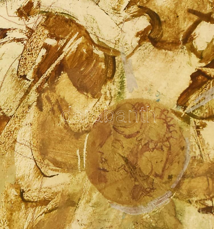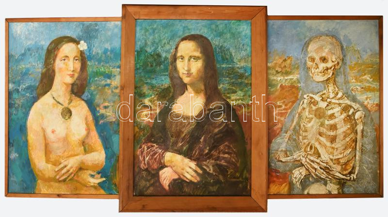 Gulyás Dénes (1927-2003): Mona Lisa elvesztette mosolyát (cím nélkül), 1977. Olaj, farost, jelezve jobbra lent. Fakeretben. 80x175 cm. A festő egyik főműve! KIZÁRÓLAG SZEMÉLYES ÁTVÉTEL, NEM POSTÁZZUK!/ Dénes Gulyás (1927-2003): Mona Lisa lost her smile (untitled), 1977. Oil on wood fibre, signed lower right. Framed. 80x175 cm. ONLY PERSONAL COLLECTION IN OUR OFFICE!