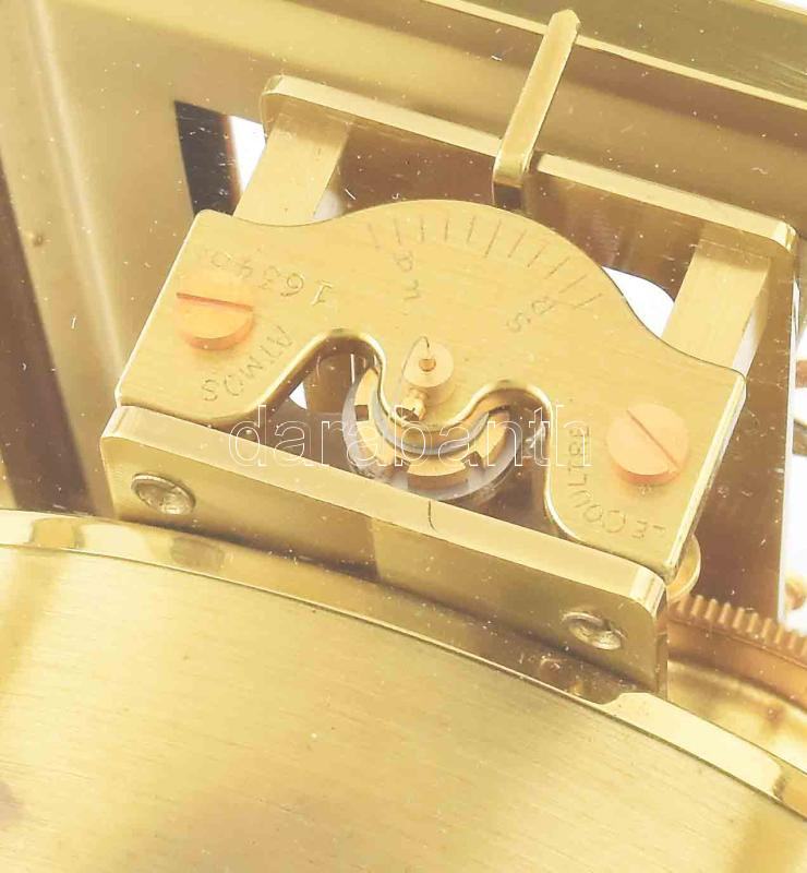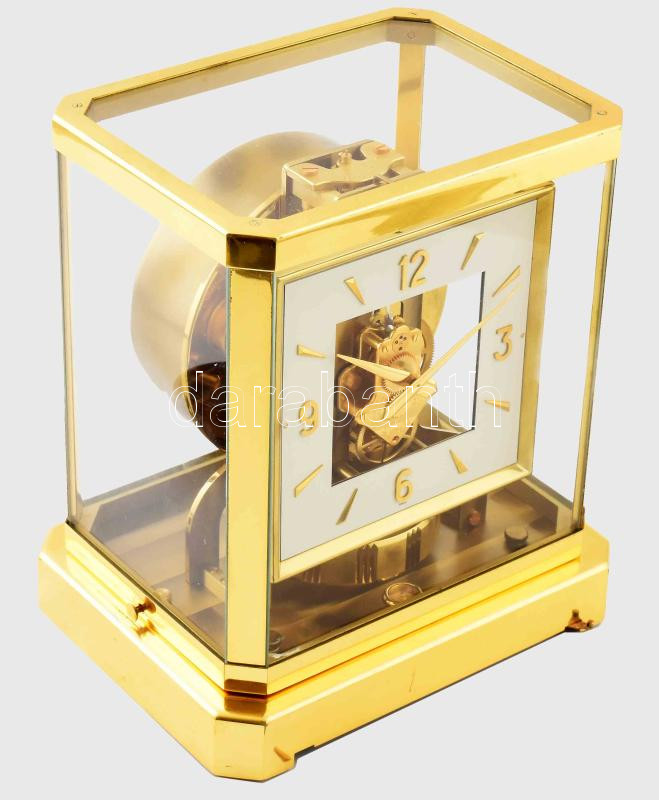 Jaeger Le Coultre Atmos asztali óra 528-68 szerkezettel 1963-ból. Aranyozott tok, üveg oldalakkal. Az óraszerkezet felhúzást nem igényel. A szerkezet hátán található tartály klóretán gázt, egy membránt és egy spirálrugót tartalmaz. A gáz a hőmérséklet legapróbb változására tágul vagy szűkül, ezzel mozgatva a membránt. 1 Celsius-fok hőmérséklet-változás hatására a szerkezet 48 órányi járástartalékot képez . Szerkezetszám; 209284 Működő szép állapotban szervíz igazolással. 163358 240x200x170 mm