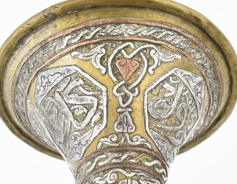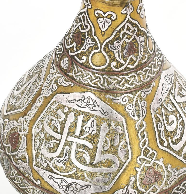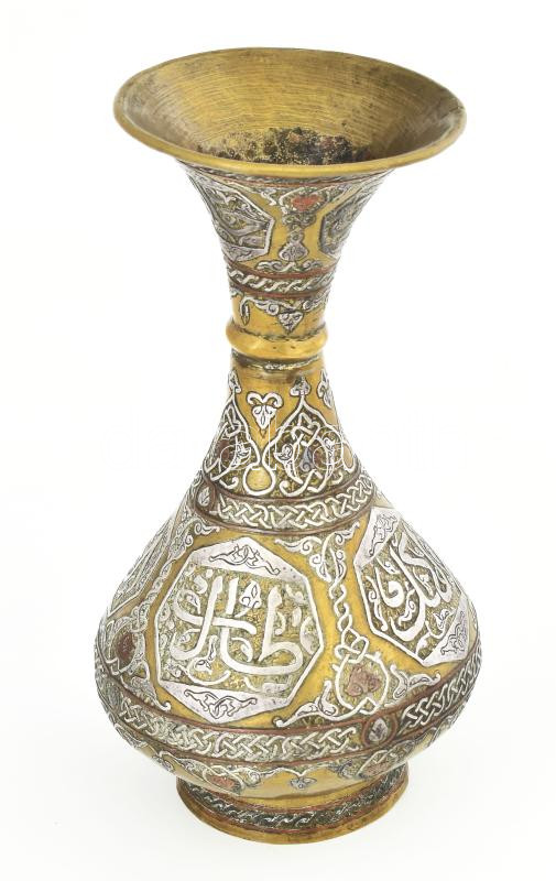Mamluk váza. Szíria, 19. sz. vége, bronz, ezüst (Ag), réz, m: 22,5 cm