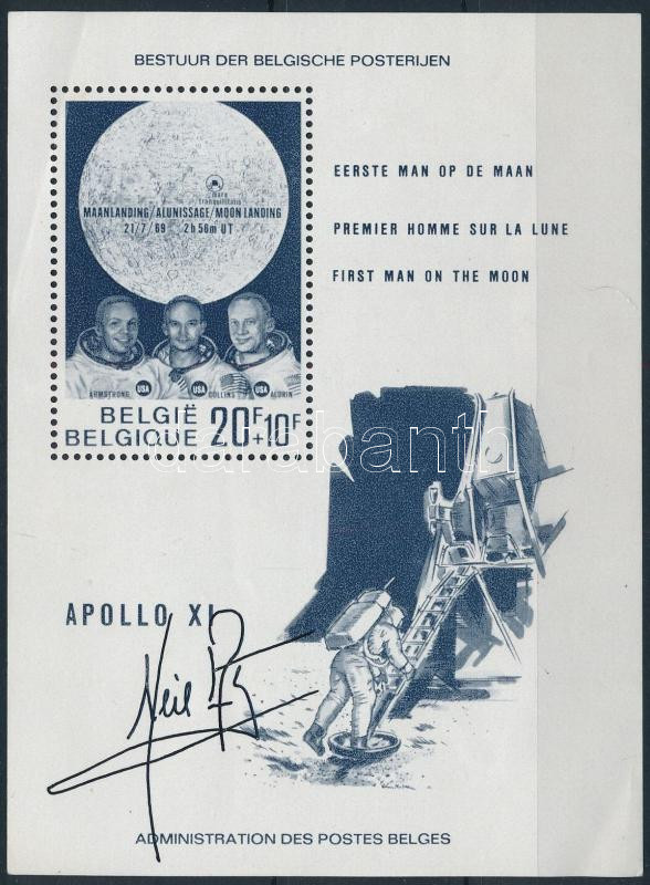 Neil Armstrong (1930-2012), amerikai űrhajós aláírása belga Holdraszállás bélyegblokkon / signature of Neil Armstrong (1930-2012) American astronauts on minisheet.