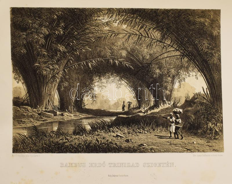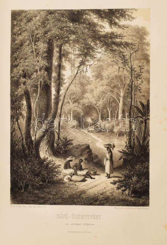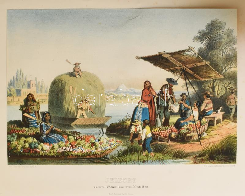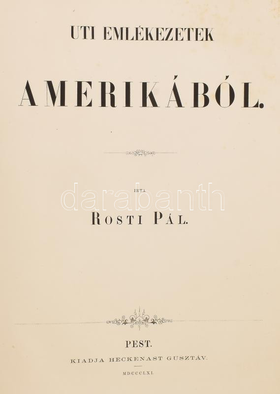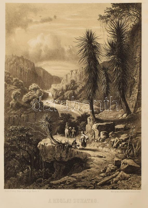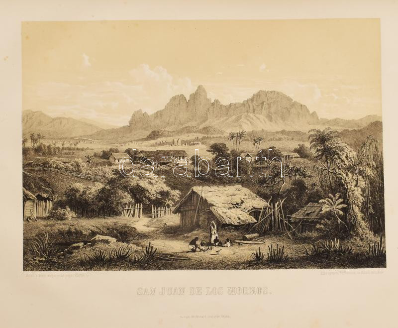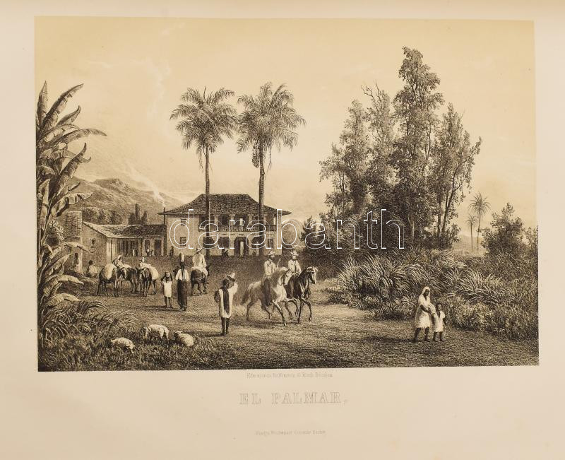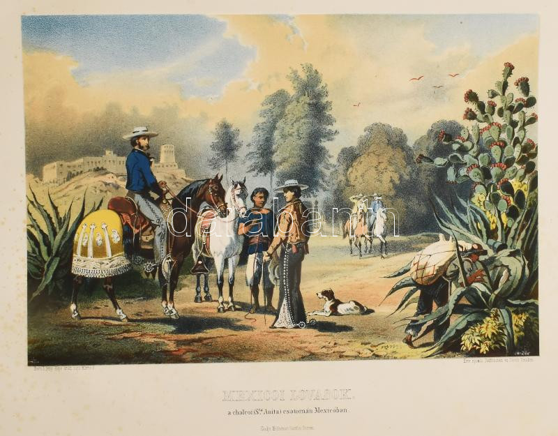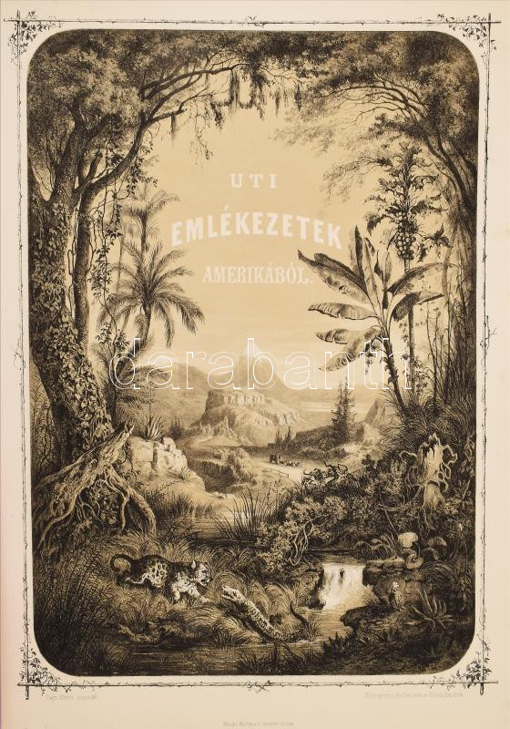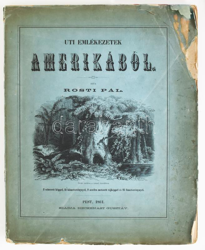 Rosti Pál: Uti emlékezetek Amerikából. Írta: - -. 2 színezett képpel, 13 kőmetszvénynyel, 2 aczélra metszett tájképpel [1 lapon] és 25 fametszvénynyel. Pest, 1861, Heckenast Gusztáv (Landerer és Heckenast, Pest), 2 p.+1 (címkép, színes litográfia) t. + 1 (díszcímlap, litográfia) t. + 198+2 p.+14 t. Összesen 16 tábla a díszcímlappal és a címképpel együtt, ebből 2 színes litográfia, 13 litográfia, és 1 táblán két osztatú acélmetszettel. A kőnyomatokat Rosti fényképei alapján Klette Gusztáv [Kelety Gusztáv (1834-1902)] rajzolta kőre, Reiffenstein és Rösch nyomtatta Bécsben. Az acélmetszetet M. Rugendas után Johann Poppel metszette, Lange nyomtatta Darmstadtban. A példányunkban található 2 színes kőnyomatos tábla a kereskedelemben előforduló kötetek jelentős részébe nincs bekötve! Első kiadás! A magyar utazási irodalom egyik legszebb kiadványa. Szerzője barkóczi Rosti Pál (1830-1874) földrajztudós,utazó, néprajztudós, fotográfus. Testvére, Rosty Ágnes (1825-1913) révén Eötvös József, valamint másik testvére Rosty Ilona (1826-1870) Trefort Ágoston sógora volt. Károlyi-huszárként harcolt a szabadságharcban, ezért menekülnie kellett. Münchenben és Párizsban tanult, többek között fényképészetet, majd alapos felkészülés után 1856 és 1859 között bejárta Texast, Közép-Amerikát, a Karib-szigeteket és Dél-Amerika északi részét. Hazatérése után megfigyeléseit, élményeit papírra vetette, és az általa készített képekkel együtt kiadatta. E műve alapján választotta a Magyar Tudományos Akadémia levelező tagjává. A kötet képei kivételes technikai változatosságot mutatnak: a színezett kőrajzok, a tónusos litográfiák, az acélmetszetű képek és a fametszetek a korszak képsokszorosítási eljárásainak legfontosabb változatai. Közép- és Dél-Amerikában készült felvételei a tájék legelső fotográfiai rögzítései közé tartoznak, ezért a művet a fotótörténészek is számon tartják. Kiadói kék papírkötésben, az elülső borító szélén hiánnyal, kissé foltos, kissé szakadt borítóval, sérült gerinccel, az elülső szennylap szélén folttal, foxing foltos lapokkal, a táblák előtti egyik hártyapapír szakadt. Felvágatlan példány!