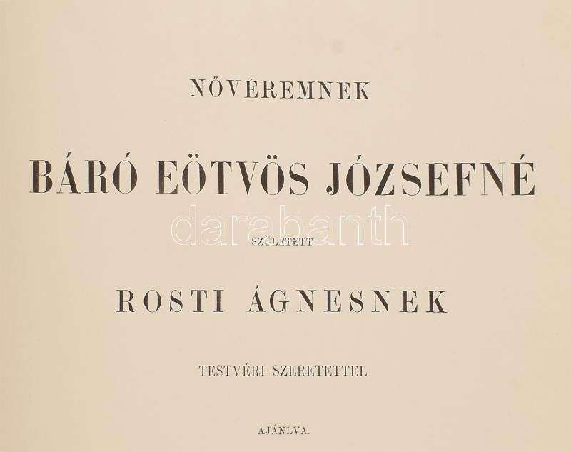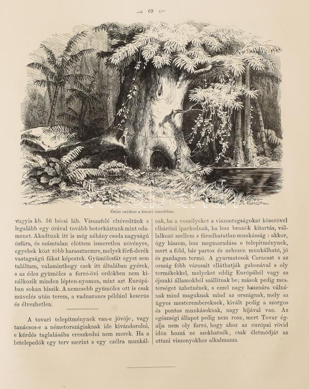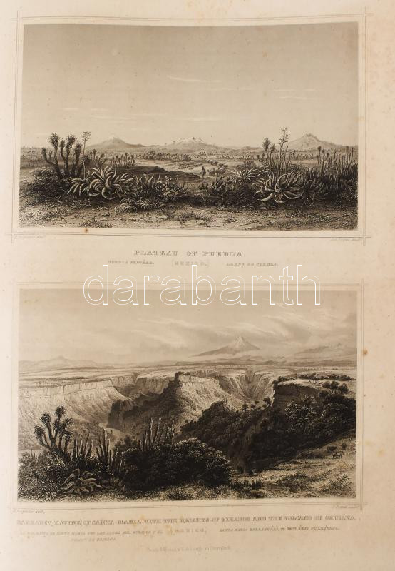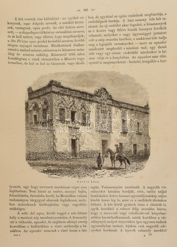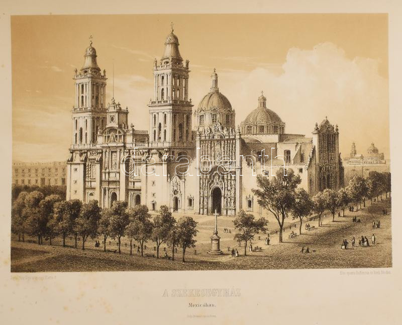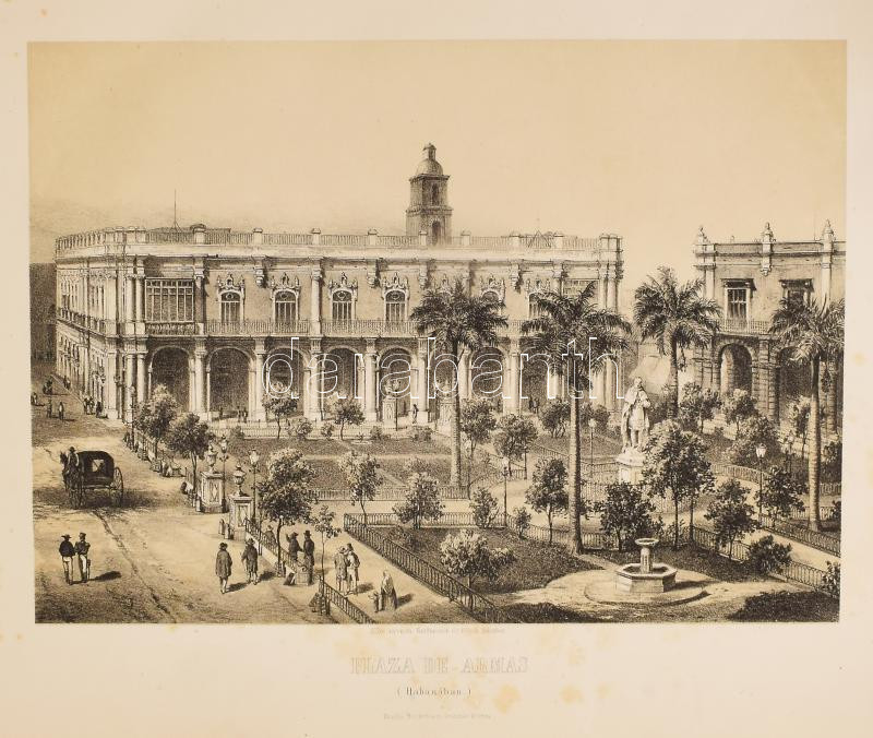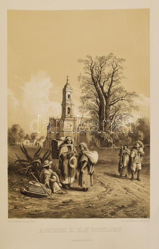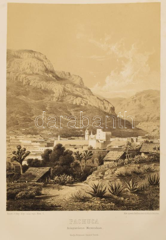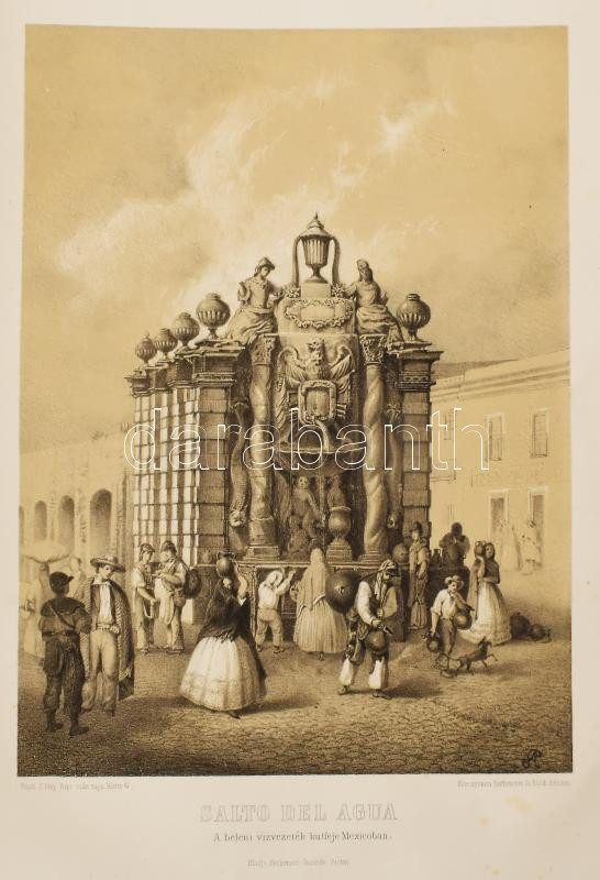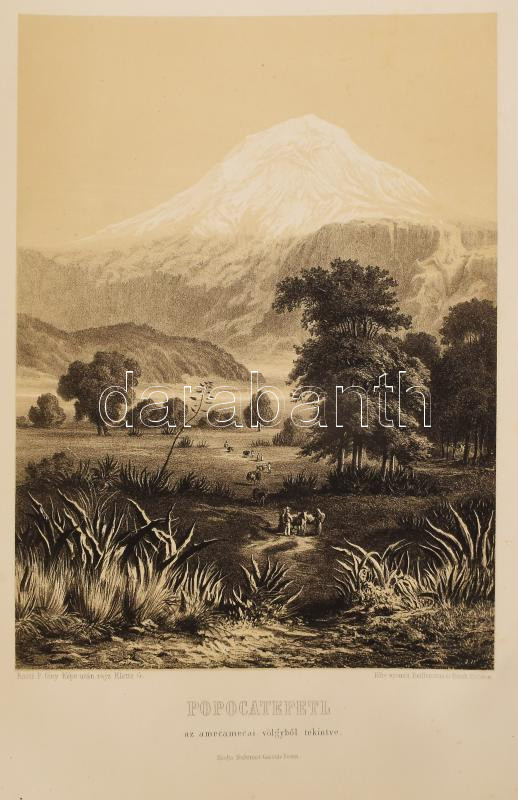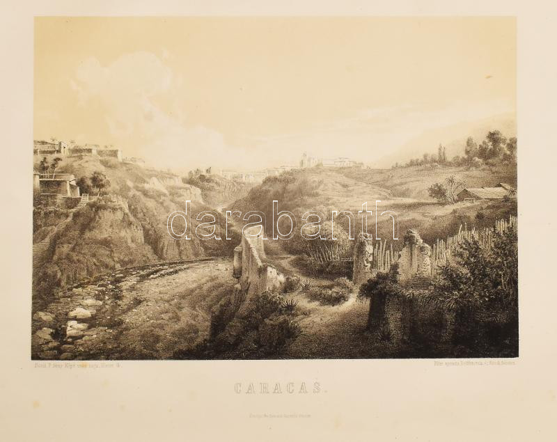 Rosti Pál: Uti emlékezetek Amerikából. Írta: - -. 2 színezett képpel, 13 kőmetszvénynyel, 2 aczélra metszett tájképpel [1 lapon] és 25 fametszvénynyel. Pest, 1861, Heckenast Gusztáv (Landerer és Heckenast, Pest), 2 p.+1 (címkép, színes litográfia) t. + 1 (díszcímlap, litográfia) t. + 198+2 p.+14 t. Összesen 16 tábla a díszcímlappal és a címképpel együtt, ebből 2 színes litográfia, 13 litográfia, és 1 táblán két osztatú acélmetszettel. A kőnyomatokat Rosti fényképei alapján Klette Gusztáv [Kelety Gusztáv (1834-1902)] rajzolta kőre, Reiffenstein és Rösch nyomtatta Bécsben. Az acélmetszetet M. Rugendas után Johann Poppel metszette, Lange nyomtatta Darmstadtban. A példányunkban található 2 színes kőnyomatos tábla a kereskedelemben előforduló kötetek jelentős részébe nincs bekötve! Első kiadás! A magyar utazási irodalom egyik legszebb kiadványa. Szerzője barkóczi Rosti Pál (1830-1874) földrajztudós,utazó, néprajztudós, fotográfus. Testvére, Rosty Ágnes (1825-1913) révén Eötvös József, valamint másik testvére Rosty Ilona (1826-1870) Trefort Ágoston sógora volt. Károlyi-huszárként harcolt a szabadságharcban, ezért menekülnie kellett. Münchenben és Párizsban tanult, többek között fényképészetet, majd alapos felkészülés után 1856 és 1859 között bejárta Texast, Közép-Amerikát, a Karib-szigeteket és Dél-Amerika északi részét. Hazatérése után megfigyeléseit, élményeit papírra vetette, és az általa készített képekkel együtt kiadatta. E műve alapján választotta a Magyar Tudományos Akadémia levelező tagjává. A kötet képei kivételes technikai változatosságot mutatnak: a színezett kőrajzok, a tónusos litográfiák, az acélmetszetű képek és a fametszetek a korszak képsokszorosítási eljárásainak legfontosabb változatai. Közép- és Dél-Amerikában készült felvételei a tájék legelső fotográfiai rögzítései közé tartoznak, ezért a művet a fotótörténészek is számon tartják. Kiadói kék papírkötésben, az elülső borító szélén hiánnyal, kissé foltos, kissé szakadt borítóval, sérült gerinccel, az elülső szennylap szélén folttal, foxing foltos lapokkal, a táblák előtti egyik hártyapapír szakadt. Felvágatlan példány!