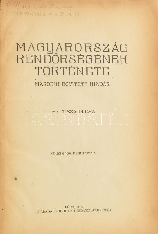 Tisza Miksa: Magyarország rendőrségének története. Pécs, 1925,"Haladás", 395+3 p. Második, bővített kiadás. Átkötött kissé kopott egészvászon-kötés, volt könyvtári példány, az elülső szennylapon szakadással, törésnyommal, régi intézményi bélyegzéssel. Rendkívül ritka!